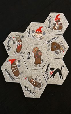 Í hverri pakkningu eru 8 fallegar glasamottur úr gráu filt efni, bróderaðar með myndum af íslensku jólasveinunum og fjölskyldu þeirra.