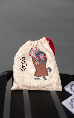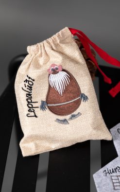 Glasamottusettið kemur í fjölnota strigapoka með fallegu bróderuðu mynstri – annað hvort Grýlu eða Leppalúða.