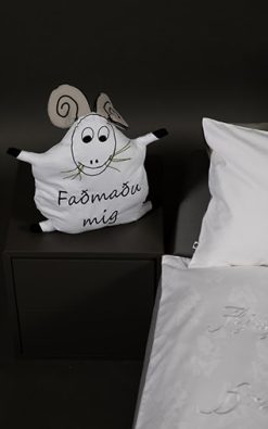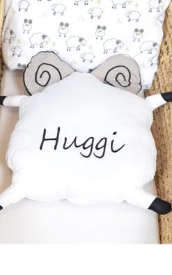 Íslenska sauðkindin er áberandi í íslensku landslagi og við völdum stóran og sterkan forystusauð sem myndefni. Hrúturinn Huggi sem er hannaður úr mjúkri bómull passar börnin með stóru hornunum sínum, huggar þau og faðmar. Huggi kemur í lítilli fatalínu, auk sængurvers, baðslopps og fleiri fylgihluta. Gæludýrið Huggi faðmar og passar börnin.