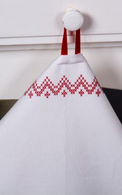 Jólakötturinn viskustykkið frá Lín Design er skemmtileg og hlýleg viðbót í eldhúsið um hátíðarnar. Lín Design jólakötturinn með rauða slaufu er áprentaður á hvítt viskustykki með fallegri, rauðri krosssaumslínu sem minnir á gamla íslenska útsaumi.