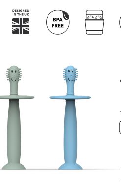 Margverðlaunuð tanntökuvara frá Matchstick Monkey – hönnuð til að gera fyrstu tannburstun barnsins bæði skemmtilega og örugga. Þessir mjúku æfingatannburstar eru gerðir úr matarhæfu sílikoni og hannaðir með öryggisstoppara sem kemur í veg fyrir að barnið stingi burstanum of langt inn í munninn.